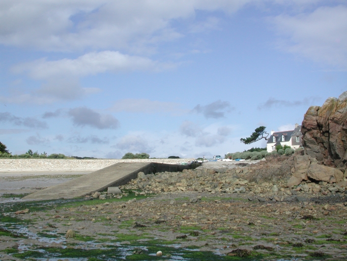 Vue de la cale de Pors Hir depuis la grève : remarquer la pente de la 2e partie de la cale de basse merImmatriculation
