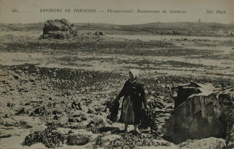 Plougrescant. Pêcheuse de goémons sur la côte : une activité vivrière et lucrative, début 20ème siècle (carte postale, collection particulière)Immatriculation