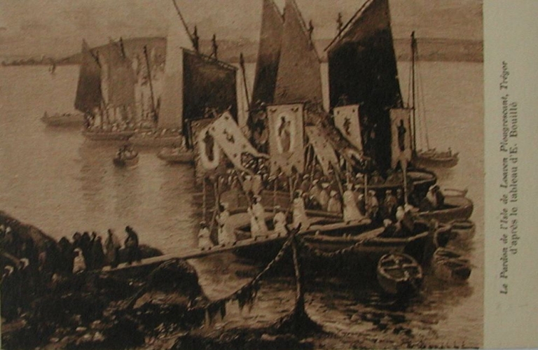 Le pardon à l'Île Loaven, d'après un tableau de Etienne Bouillé : remarquer le mode de débarquement, début 20ème siècle (carte postale, collection particulière)Immatriculation