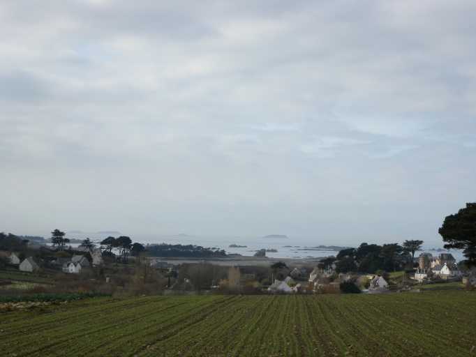 Plougrescant. Vue du front de mer d'une commune rurale et maritime, entre Pors Scaff et la Pointe du Château : remarquer les champs cultivésImmatriculation