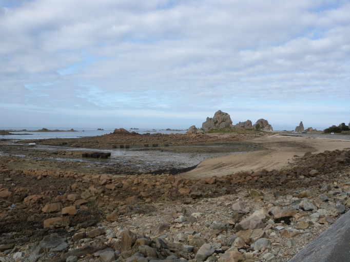 Vue général des aménagements de Pors Scaff : la digue et le parkingImmatriculation