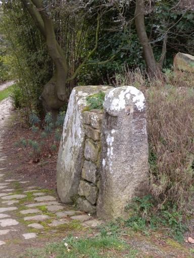 Plougrescant. Ancienne pierre d'entrée de champ ouvragée, ouvrant aujourd'hui sur une propriété privéeImmatriculation
