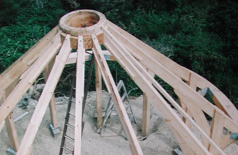 Vue de détail de la charpente assemblée au préalable : remarquer les poutres en biais (collection particulière)Immatriculation
