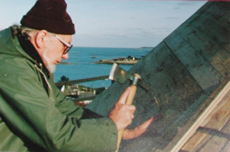 Vue du charpentier amoulangeur Jean Peillet en train de poser les bardaux (collection particulière)Immatriculation