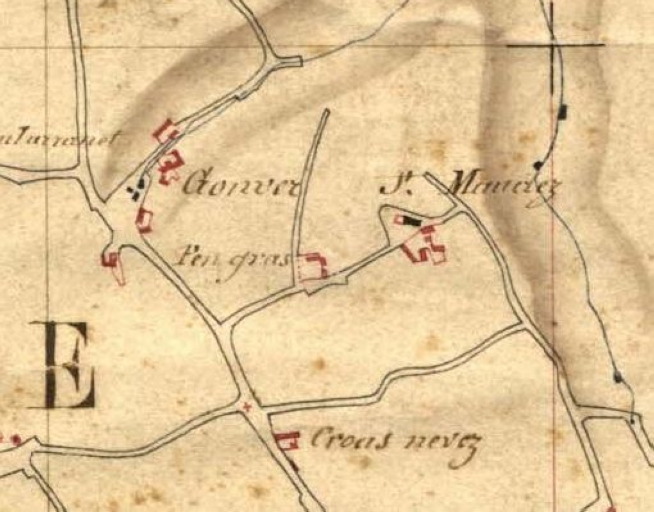 Extrait du cadastre de 1834, E 2ème feuille : l'emplacement de la fontaine et de la chapelle de Saint-Maudez (AD 22)Immatriculation