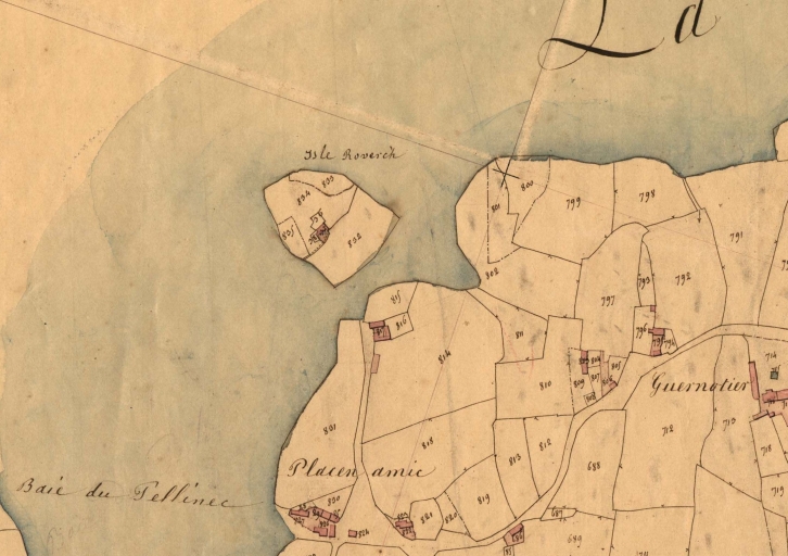 Extrait du cadastre de 1834, A832 à 837 : Île Roverc'h, dont on peut remarquer les parcelles bâties (AD 22)Immatriculation