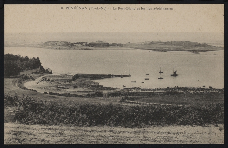 Le Port-Blanc, le port et les îles, vers 1904-1908 : remarquer la forme générale des ouvrages portuaires (carte postale, AD 22)Immatriculation