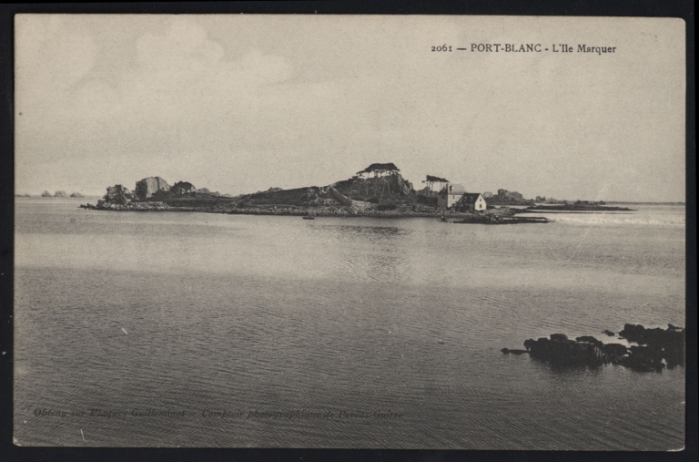 Bâti insulaire sur l'île Marquer, 1er quart 20ème siècle : remarquer la pêcherie en partie immergée à marée haute (carte postale, AD 22)Immatriculation