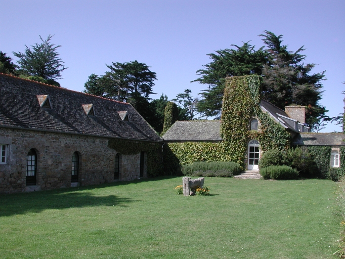 Vue des dépendances : remarquer les couvertures en lauze, les encadrements en briques des ouvertures en plein cintreImmatriculation