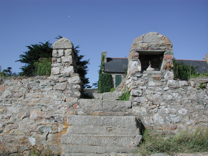 Vue de l'entrée de la propriété de l'île : remarquer la niche abritant une statuette, en haut de l'escalierImmatriculation