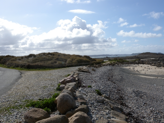 Vue des enrochements recouverts par les galets de la plage (entre la digue de Crec'h Avel et la digue de Port-Blanc)Immatriculation
