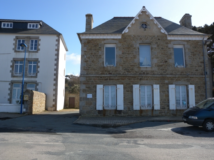 Vue d'une habitation traditionnelle en front de port, inspirée de l'architecture balnéaire : remarquer le fronton sur-élevé en triangle, les ouvertures en oeil de bœufImmatriculation