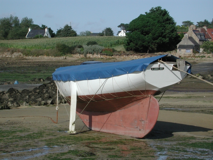 Vue des formes de l'arrière d'un monotype de Carantec : remarquer la rablure ronde et le joli et fin tableau en forme de coeur (baie de Pellinec)Immatriculation