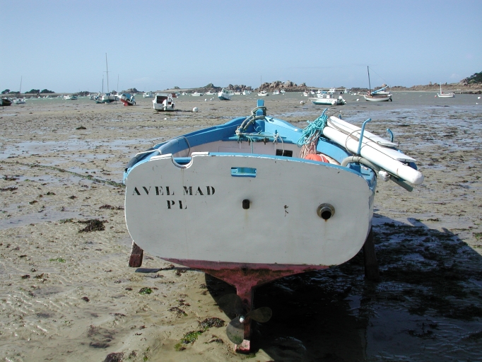Vue du misainier 'Avel Mad', 4 m, motorisé in-board, membrures franches et étrave tulipée avec une tonture élégante, au mouillage du Port-BlancImmatriculation