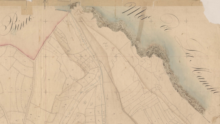 Extrait du cadastre de 1813, section C1ère feuille : entre Binic et Pordic, la côte des falaises et les grandes parcelles exploitées en cultures (AD 22)Immatriculation
