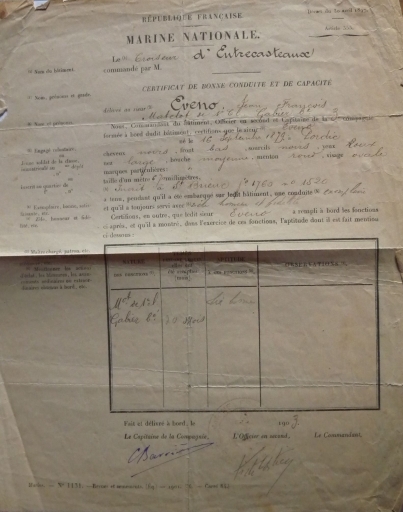 Certificat de bonne conduite et de capacité de Jean François Eveno, embarqué en 1903 sur le croiseur 'D'Entrecasteaux', comme matelot gabier (collection particulière)Immatriculation