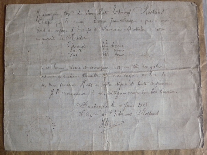 Certificat de bonne conduite et de capacité de Jean-François Eveno à bord du caboteur 'Edmond Rostand, le 10 juin 1903 (collection particulière)Immatriculation