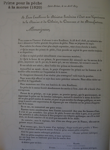 Reproduction du texte de la demande de prime pour la morue en 1829, 1ère page (CDDP 22)Immatriculation