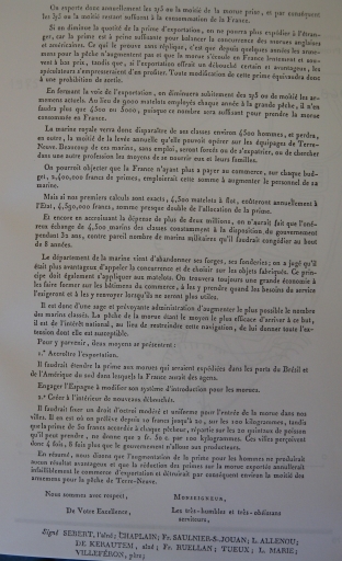 Reproduction du texte de demande de renouvellement de la prime pour la morue en 1829, par les armateurs de la baie de Saint-Brieuc, 2ème page (CDDP 22)Immatriculation