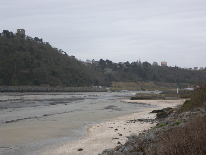Vue de l'embouchure du port du Légué, à marée basse : remarquer l'ancienne tour de Cesson sur la rive droiteImmatriculation