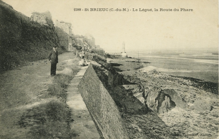 Vue du front de mer du Phare, vers 1908 : remarquer le mur-dique de soutènement et le vivier à grands crustacés dans la grève (carte postale, AD 22)Immatriculation