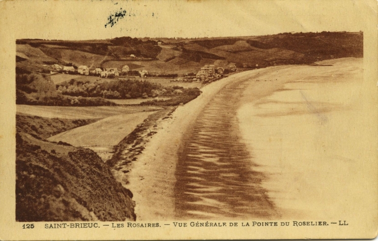La plage des Rosaires, vers 1930 : remarquer l'habitat groupé en front de mer, dans le vallon littoral (carte postale, AD 22)Immatriculation