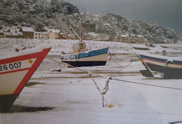 Vue du bateau de pêche sous la neige, au Légué, à côté des doris de petite pêche (collection particulière)Immatriculation