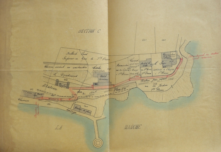 Plan du chemin du phare de la Pointe à l'Aigle à St-Laurent en 1925 : remarquer l'emplacement de la station et de l'hôtel du terminus de la voie ferrée (AD 22)Immatriculation