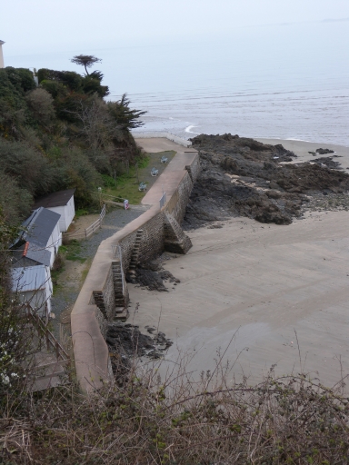 Vue du front de mer de l'anse des Moines, au niveau de la pointe Chatern : la digue-promenade, les escaliers de desserte et les cabines de bains au pied de la falaiseImmatriculation