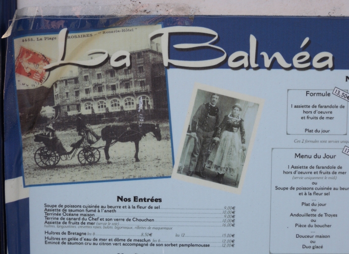 Vue de la carte postale de l'ancien hôtel 'Rosaria' et de la carte actuelle des menus (collection particulière)Immatriculation