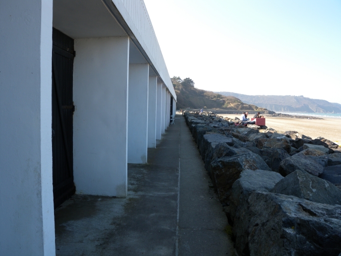 Vue des cabines de bains (structure en béton) situées dans le prolongement de la digue, vers l'OuestImmatriculation