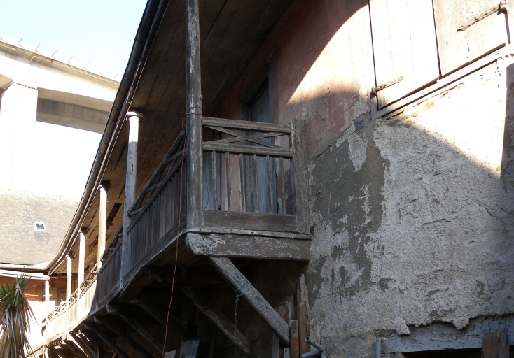 Vue du balcon en bois, daté du 16ème siècle, d'une maison en front de portImmatriculation