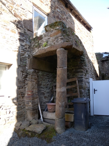 Vue du poteau en granite (pilastre), supportant un escalier extérieur, daté de la Renaissance d'une maison au port du LéguéImmatriculation