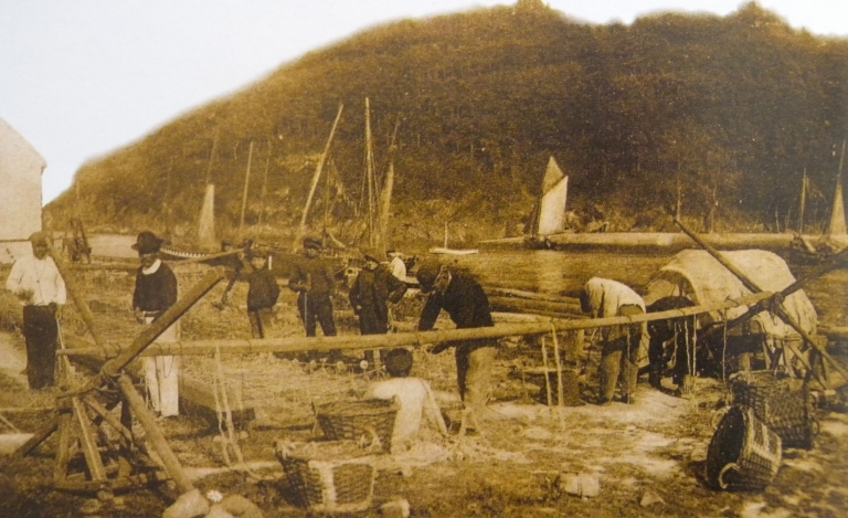 réfection des filets de pêche, Sous-la-Tour, 2ème quart 20ème siècle : remarquer le gréement de sloop qui a remplacé le gréement de lougre (carte postale, collection particulière)Immatriculation