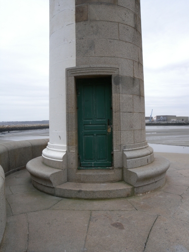 Vue de détail de la façade Sud de la tourelle : remarquer la porte d'entrée avec les moulures en granite, les chanfreins et l'évasement du pied de la tourelleImmatriculation