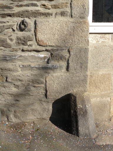 Vue de détail de l'ange antérieur droit, avec la borne de la porte cochère, les chaînes d'angle en pierre de taille et l'anneau pour atttacher les chevauxImmatriculation