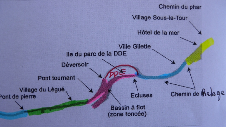 Dessin : répartition des différents front de mer entre le port du Légué et le phare de la Pointe-à-l'AigleImmatriculation