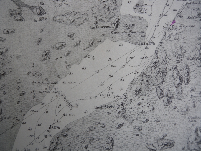 Extrait de la carte marine de la rivière de Tréguier, relevée en 1837 : la tourelle blanche sur l'îlot Roc'h Skeiviek (EPSHOM)Immatriculation