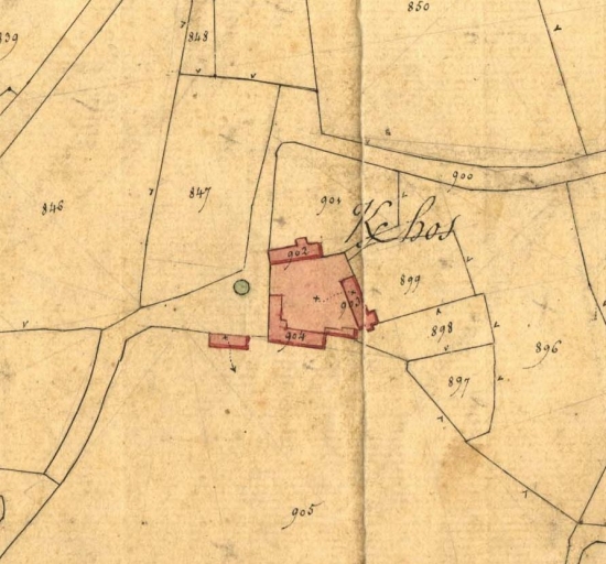 Extrait du cadastre de 1829 : le manoir de Kerhos et la grange en E 2ème feuille parcelle 905 (AD 22)Immatriculation