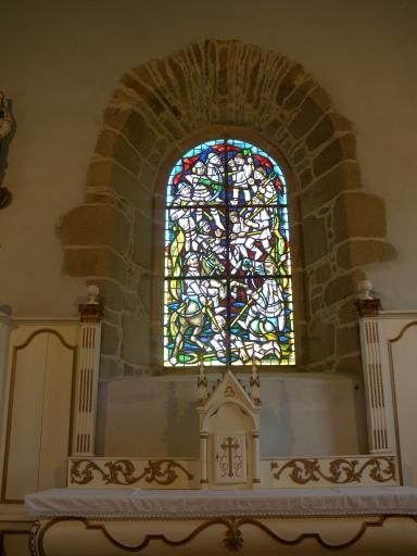 Vue intérieure du mur pignon Est de la chapelle avec l'autel et le vitrailImmatriculation