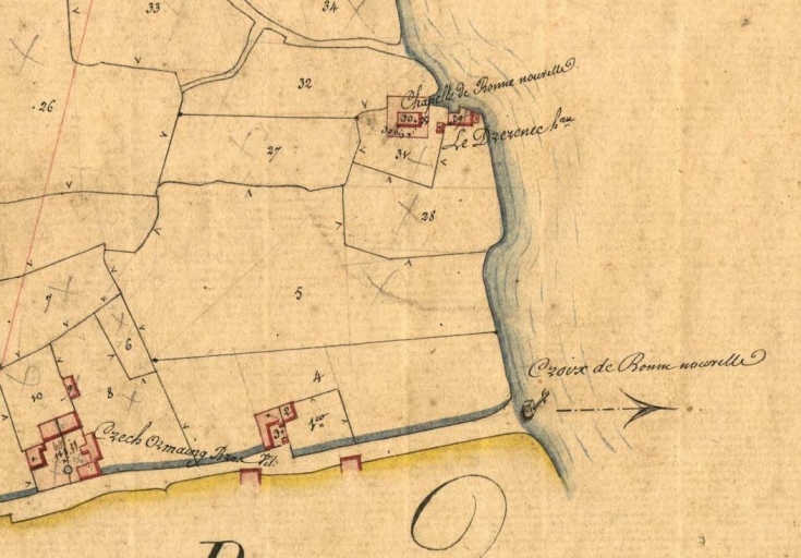 Extrait du cadastre de 1827 : la chapelle, la maison Drezennec (aujourd'hui disparue) et la croix la grève de Bonne Nouvelle, aujourd'hui disparue (AD 22)Immatriculation