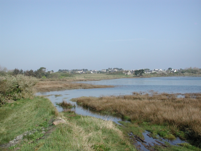 Vue du site littoral de la baie de Lanros : partie Ouest alimentée par un petit émisssaire côtier en bordure de culture et de bocage, pré salé cerné de petites digues et muretsImmatriculation