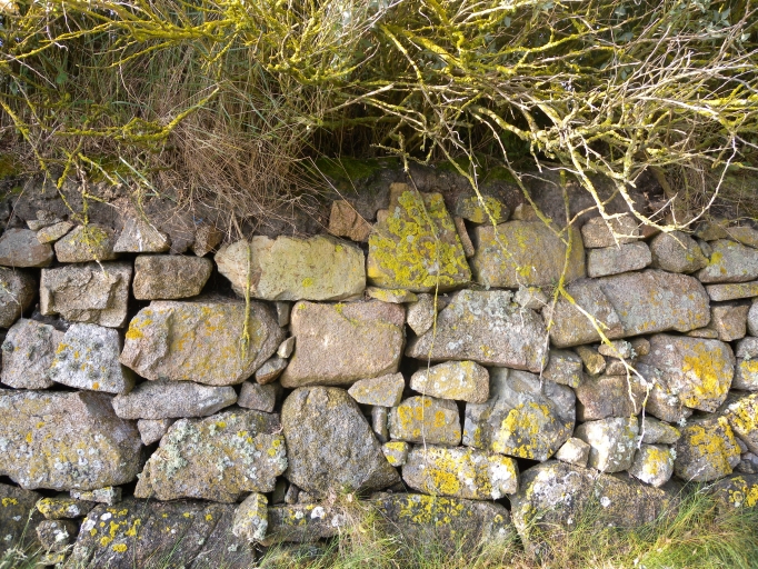 Vue de détail du muret de Lanros, édifié en moellons de granite, sans liantImmatriculation