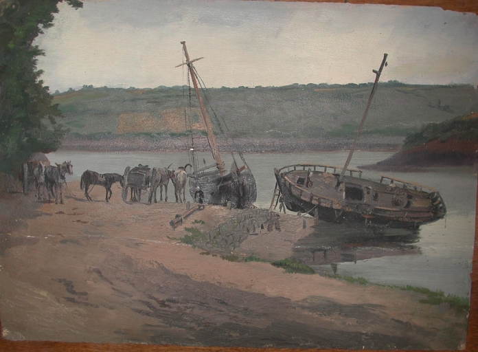 Huile sur carton de Louis-Marie Faudacq : déchargement de gabarre sur une rive du Trieux, 1er quart 20ème siècle (collection particulière)Immatriculation