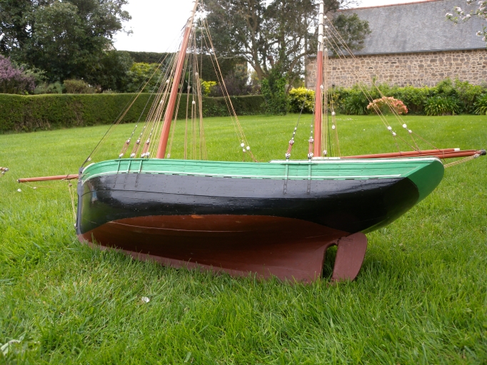 Vue des formes générales de la coque : remarquer le bordé d'échouage et les formes bien dégagées de l'arrièreImmatriculation