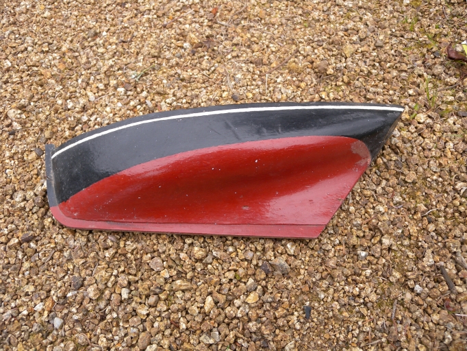 Vue de détail de la demi-coque, face antérieure : remarquer le fort tirant d'eau et la finesse du tableauImmatriculation