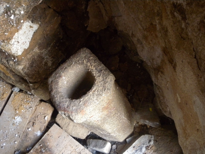 Vue de détail de l'ouverture en creux du tronc traditionnel en granite (sans son cercle fermoir en métal)Immatriculation