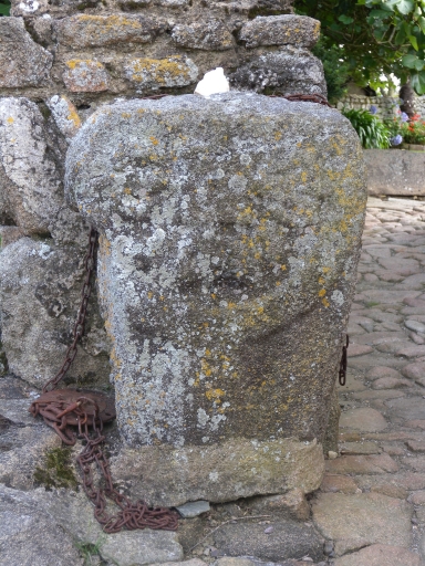 Vue d'une pierre sculptée avec une forme de croix celtique (?), encastrée dans un muret (pierre rapportée)Immatriculation