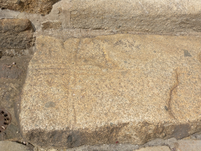 Vue de détail d'une sculpture en relief sur une pierre de granite, posée sur champ devant l'ouverture de l'ancienne métairie (pierre déplacée)Immatriculation