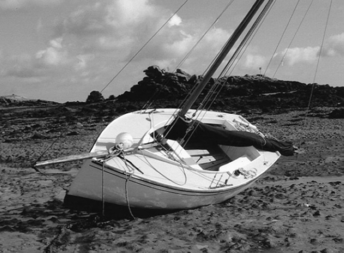 Vue du bateau à l'échouage sur son bordé : le plan de pont ouvert (Marc Rapilliard, collection particulière)Immatriculation